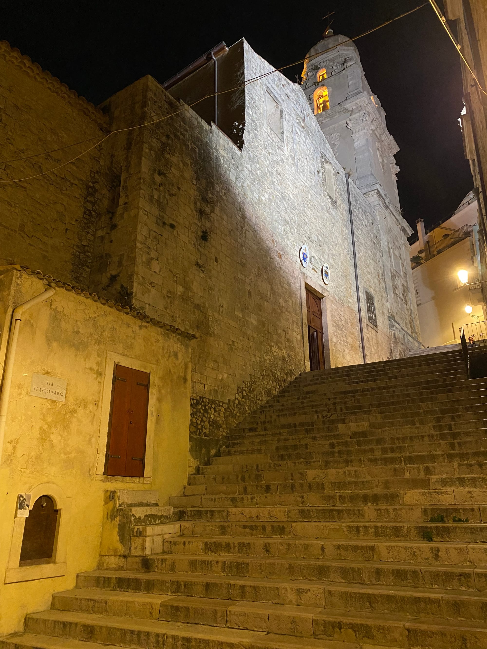 Вечером все вместе еще прошлись по городу и посмотрели, что к чему – маленький симпатичный городок, вдается в море парой скалистых мысов, некоторые дома на скалах стоят прямо над водой. Еще тут есть монструозные сооружения для ловли рыбы – трабукко – платформы с множеством торчащих из них палок или стержней, похожие на устройства для пыток или казней, такие они ассоциации вызывают в закатном красном свете. По городку приятно было погулять, людей немного, но не выглядит заброшенно, в одной церкви мы услышали пение хора и зашли послушать репетицию. Правда, из-за скалистости приходится подниматься вверх-вниз.