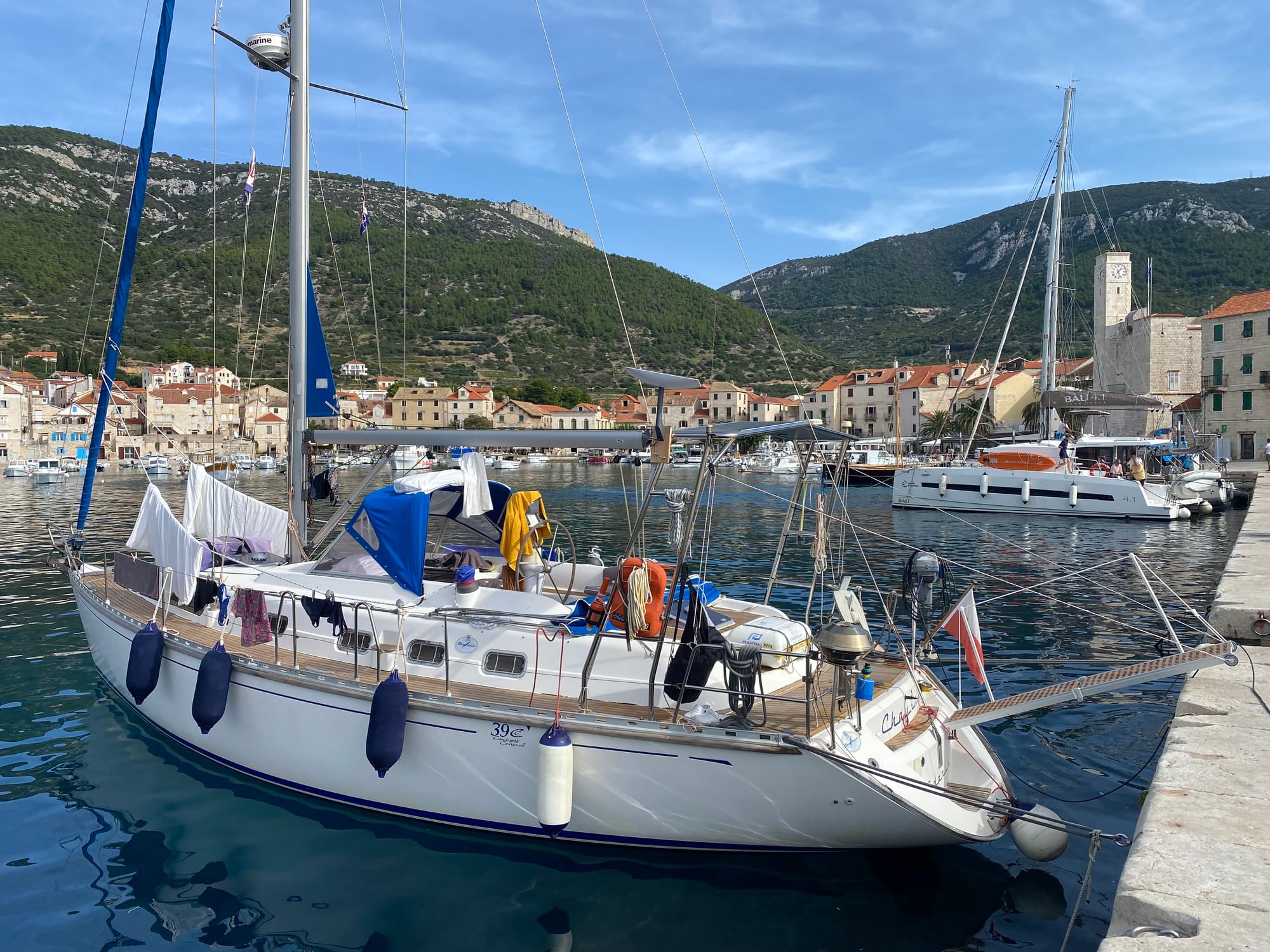 1730 швартовка в марине Задар. Узкая марина, мало места для маневрирования, я зашел кормой вперед, но потом пришлось развернуться. Стали подходить к пирсу и как-то я запутался на швартовке, когда нас 4 человека. Безветрие, кинули сначала швартов правого борта, хотя справа у нас пустое пространство, но маринейро стоял с той стороны и выдал нам муринг. Катя взяла муринг и не знала, что с ним делать. Я зачем-то дал оборотов и нас отнесло вправо, там, конечно, пусто, но мы некрасиво вывесились наискосок, муринг, который Катя держит – под лодкой, ей сил не хватает его тянуть, пришлось мне идти и вытаскивать его на бак, чтобы немного подвинуться и встать ровнее. Завели второй швартов, уже с правого борта, но он был немного длинее и не сильно помог. Пришлось повозиться туда-сюда и подтянуть муринг, наконец-то встали как надо (как можно) ровно. В общем, устроили суету на ровном месте, зато вся команда при деле была.