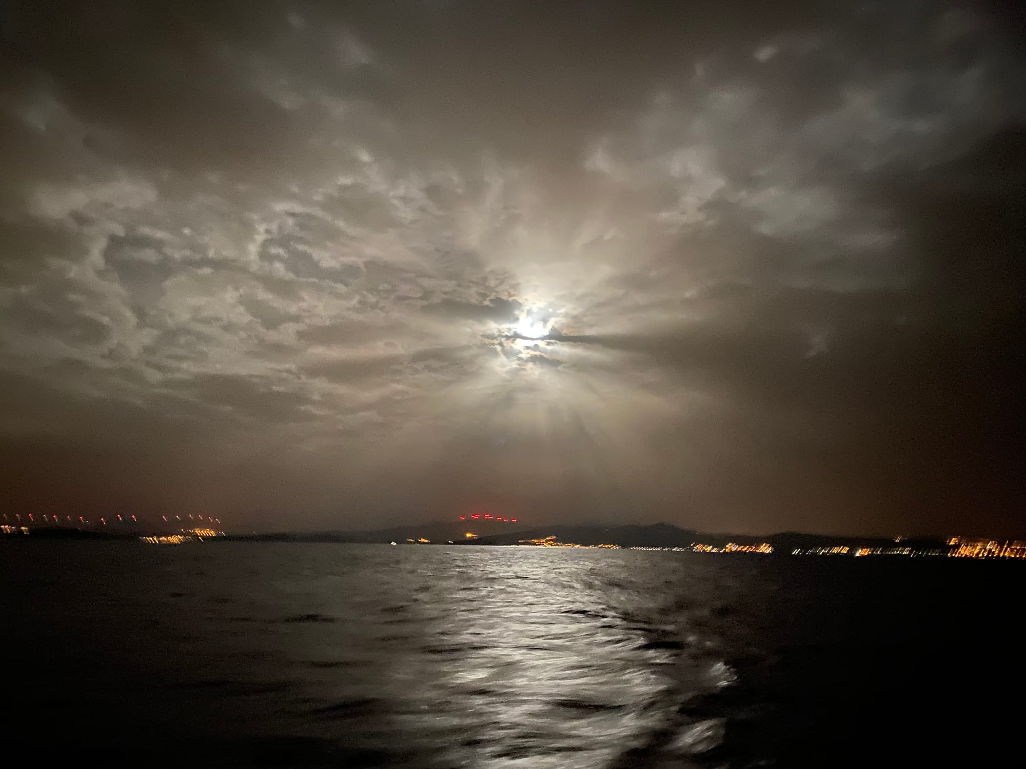 Ветер пропал почти, в проливе дует около 6-7 узлов попутного, фордевинд. Идем на моторе. В середине пролива заметная волна, до 1м, но тоже попутная, иногда мотает лодку. Тревожная луна сквозь тучи. Следим за огнями – острова и мысы обозначены.