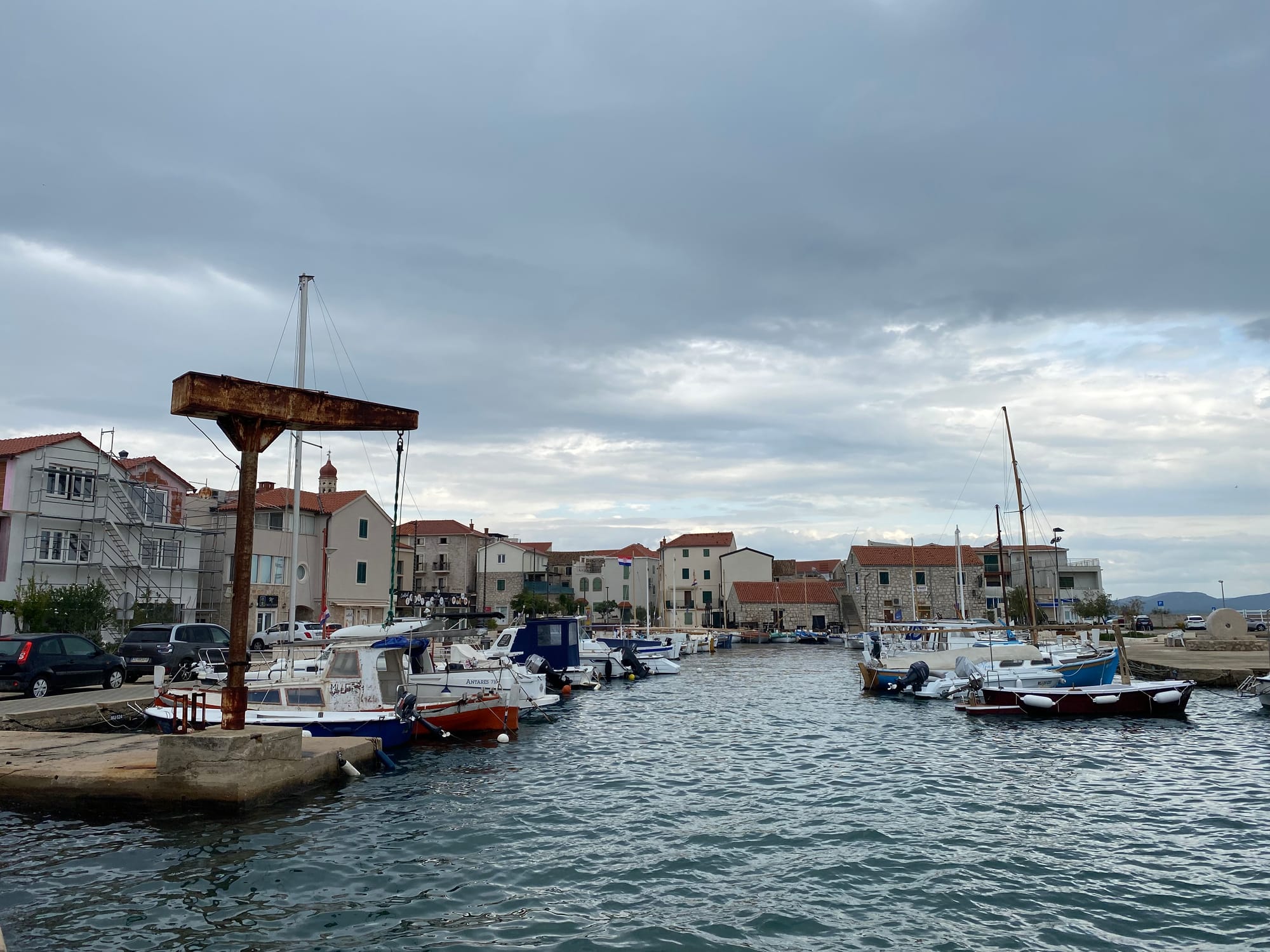 Бетина – немножко сонное место, хотя марина вполне живая, редкое (на мой непосвященный взгляд) место, где люди оставляют свои личные лодки и даже живут на них, то есть в самой марине жизнь есть, а вот в городке – пустовато. Еще и погода портится, пришел теплый фронт и принес дождь.
