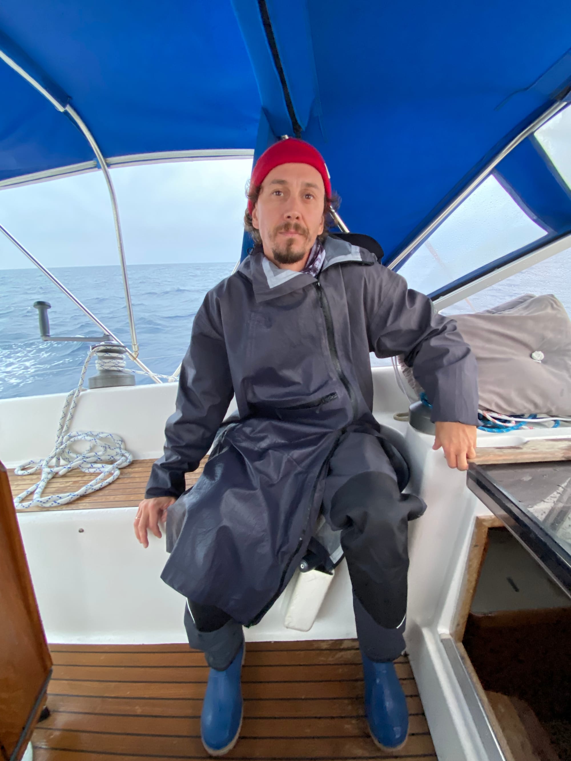 1530 штиль, работаю, сидим в кокпите и греемся на солнце. Обнаружили, что лодка недобровольно оказалась украшена к хеллоуину: за 4 дня стоянки какие-то паучки наплели паутинок на рангоуте и такелаже.