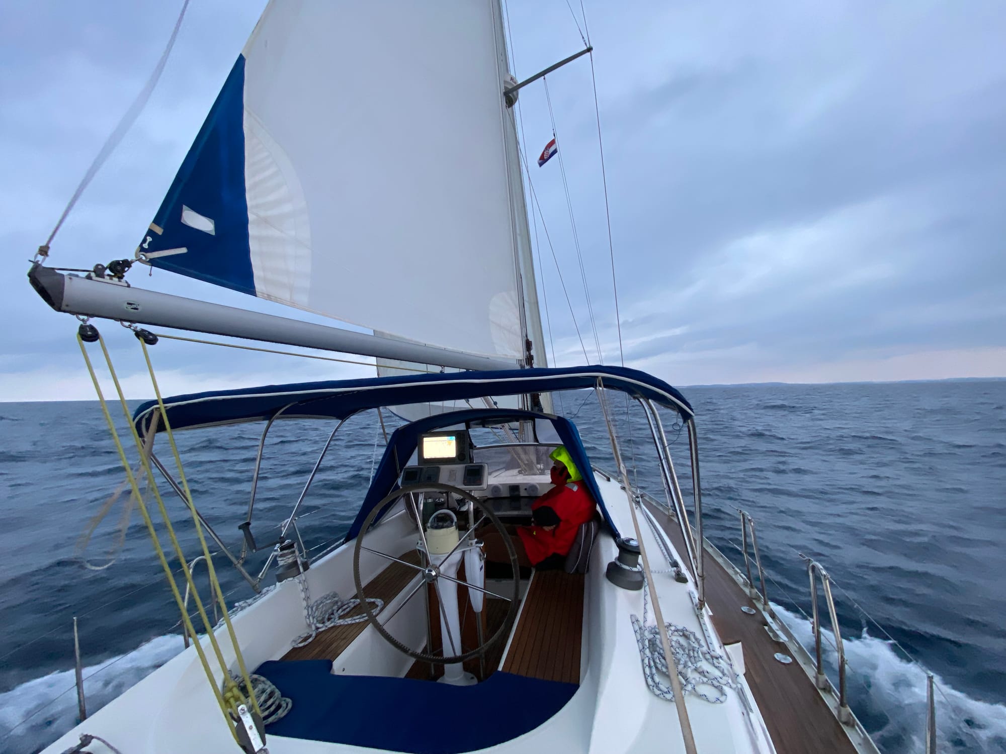 1830 прошли залив, идем вдоль Истрии, до 16 узлов дуло, когда мыс обходили, мы быстрее 7 уз. шли, уже без волны, даже встал порулить ради интереса.