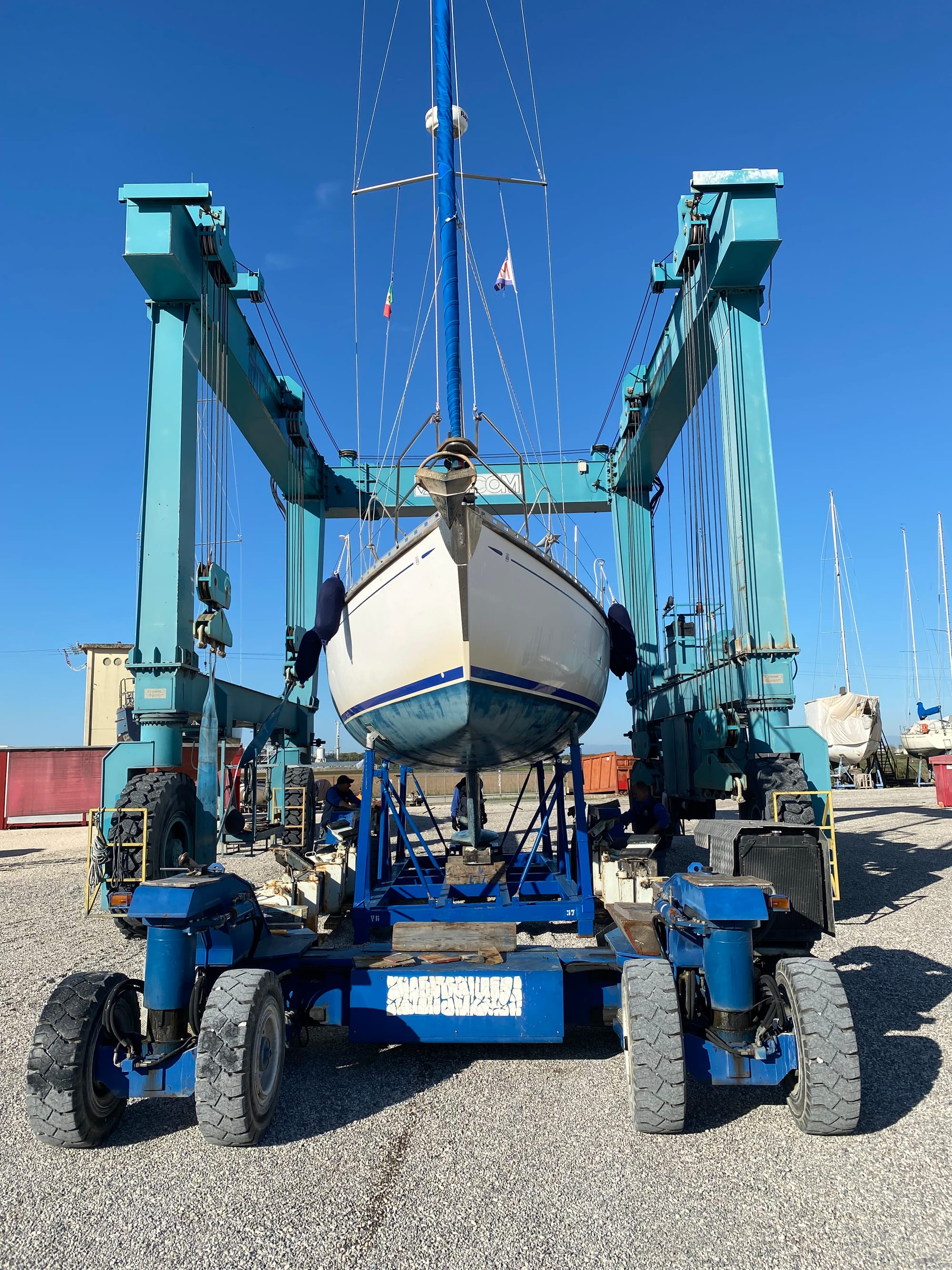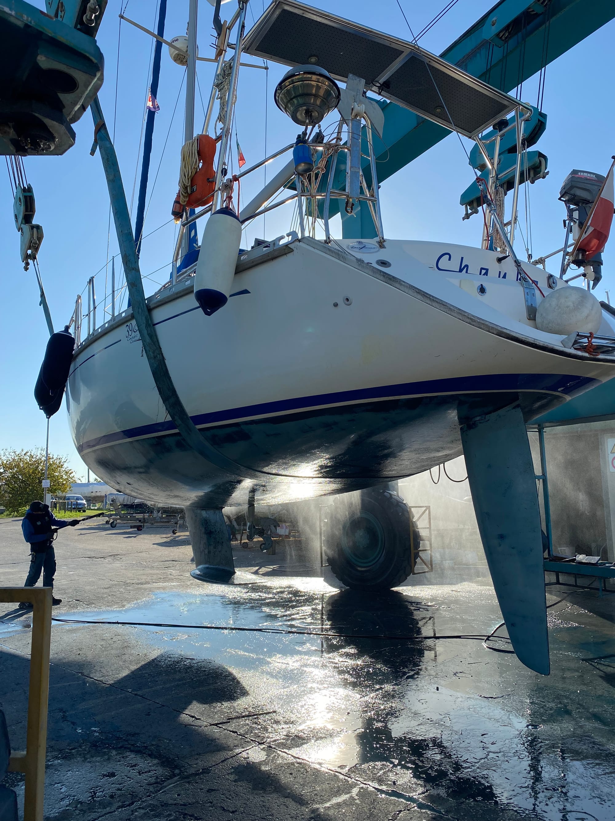 0830 перешли в слип, где подъемник, нас подняли на кране, помыли и поставили на распорки прямо напротив слипа. Потом эту подставку на которой расположилась Чайка, подняли механической тележкой- тягачом и отвезли уже на место, где лодка будет стоять всю зиму.