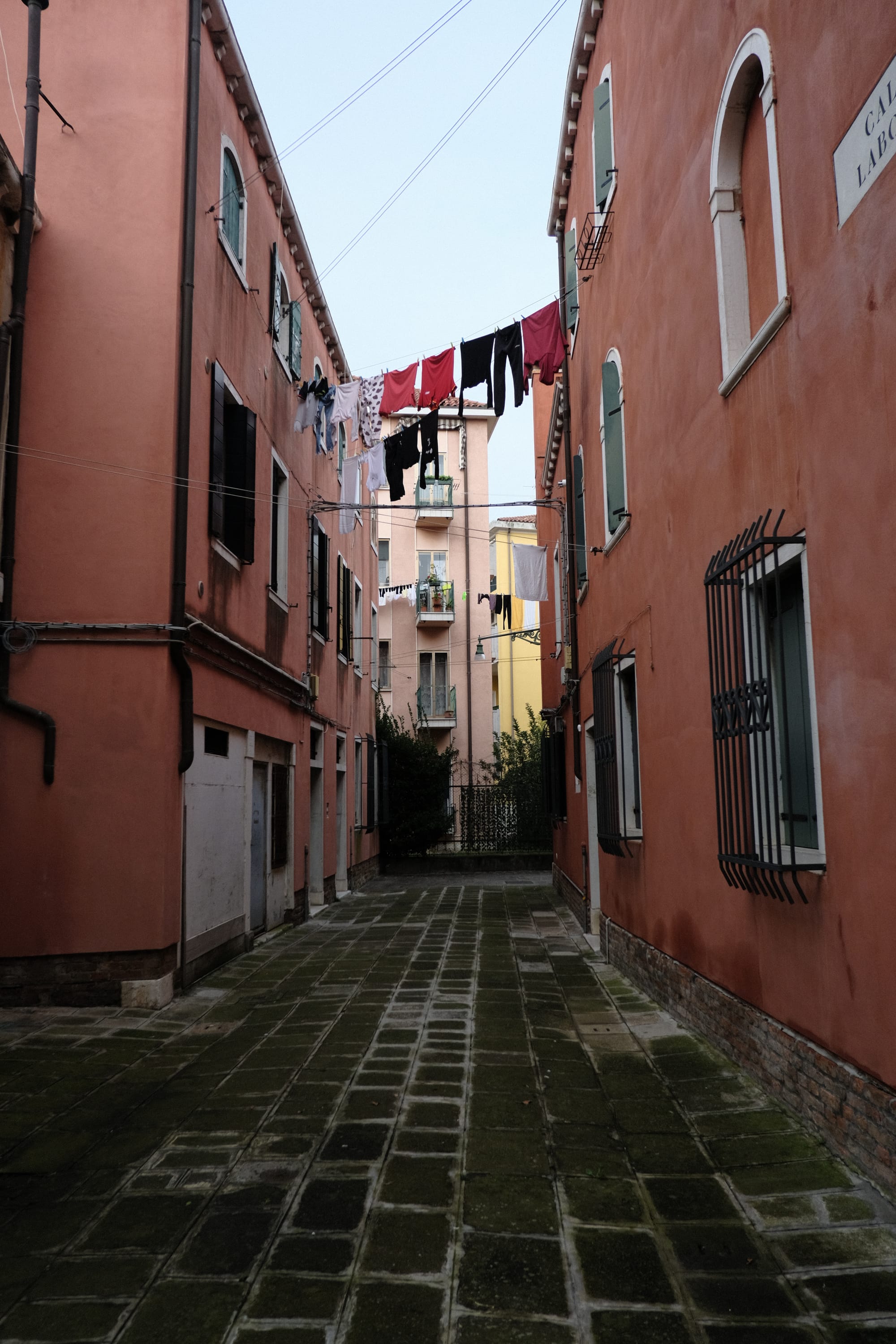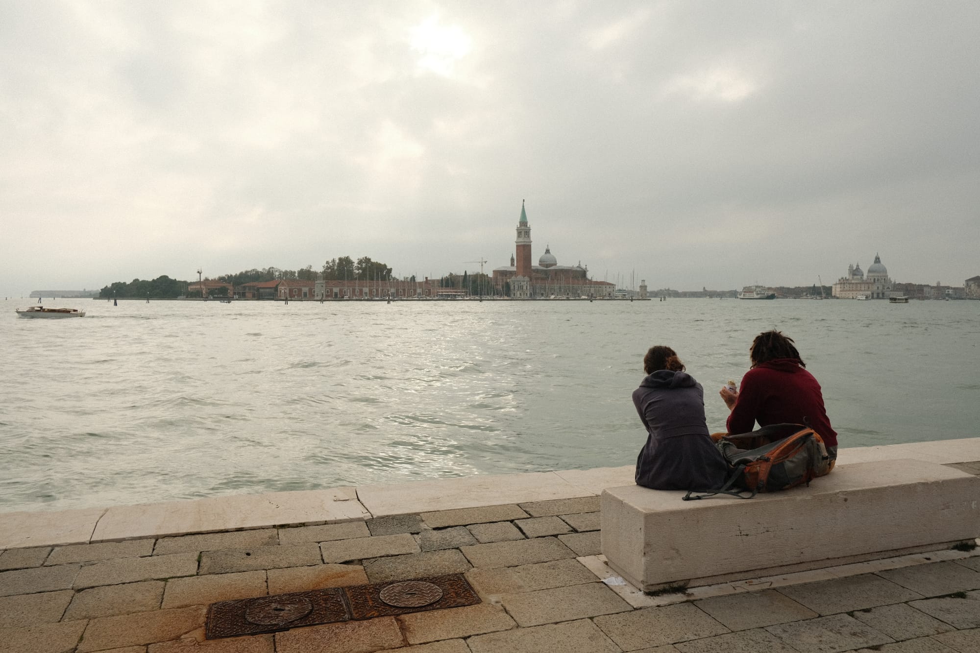 Сушим одеяла после ночного промокания, девочки смотрят город. Тут уже есть небольшие (до полуметра) приливы, поэтому в отлив выходить на высокий пирс по трапу немного неудобно. Относительно приливов – на одном из зданий (вроде школы) в Комиже установлена табличка в память о жертвах "наводнения" – высокой нагонной воды (Aqua Alta), которая затопила когда-то в шторм низкую часть города.
