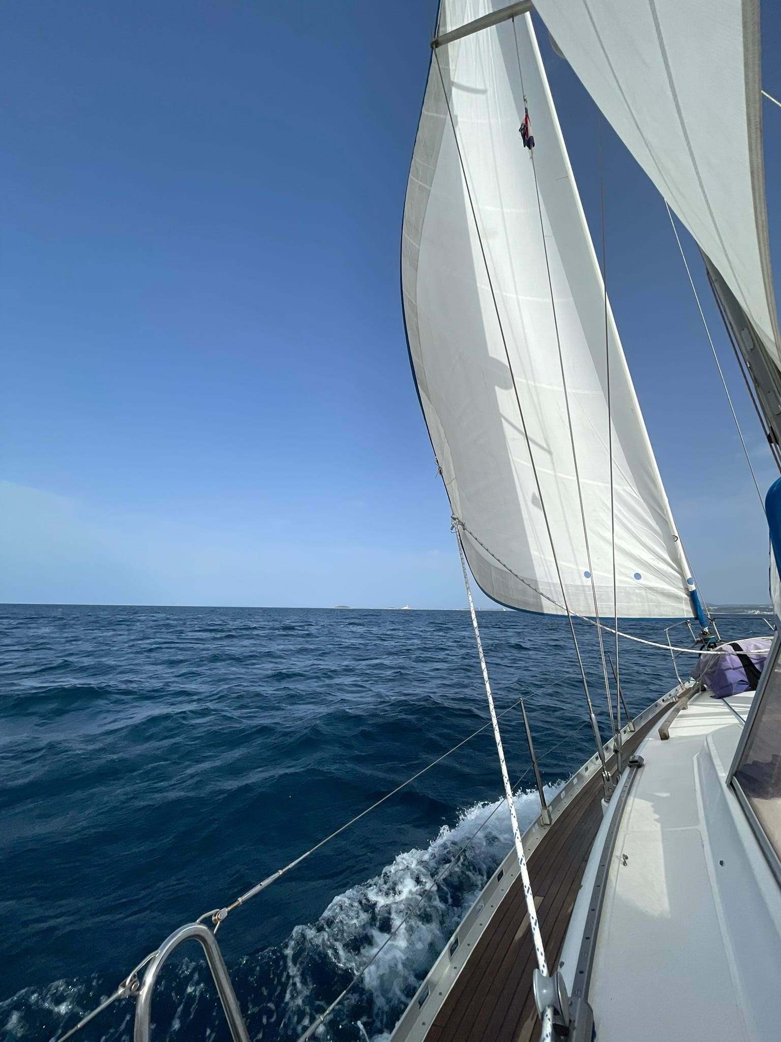 0945 позавтракали (мы с Олей – второй раз), Наташа сварила кашу. Продолжаем бодро идти полным галфиндом, до 7 узлов делаем под полными парусами.