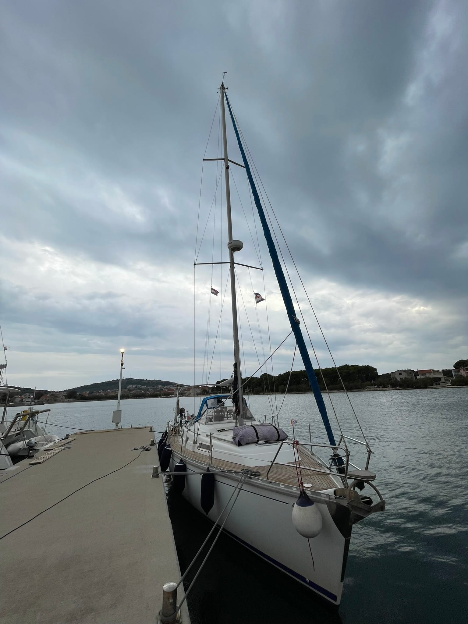 1730 швартовка в марине Задар. Узкая марина, мало места для маневрирования, я зашел кормой вперед, но потом пришлось развернуться. Стали подходить к пирсу и как-то я запутался на швартовке, когда нас 4 человека. Безветрие, кинули сначала швартов правого борта, хотя справа у нас пустое пространство, но маринейро стоял с той стороны и выдал нам муринг. Катя взяла муринг и не знала, что с ним делать. Я зачем-то дал оборотов и нас отнесло вправо, там, конечно, пусто, но мы некрасиво вывесились наискосок, муринг, который Катя держит – под лодкой, ей сил не хватает его тянуть, пришлось мне идти и вытаскивать его на бак, чтобы немного подвинуться и встать ровнее. Завели второй швартов, уже с правого борта, но он был немного длинее и не сильно помог. Пришлось повозиться туда-сюда и подтянуть муринг, наконец-то встали как надо (как можно) ровно. В общем, устроили суету на ровном месте, зато вся команда при деле была.