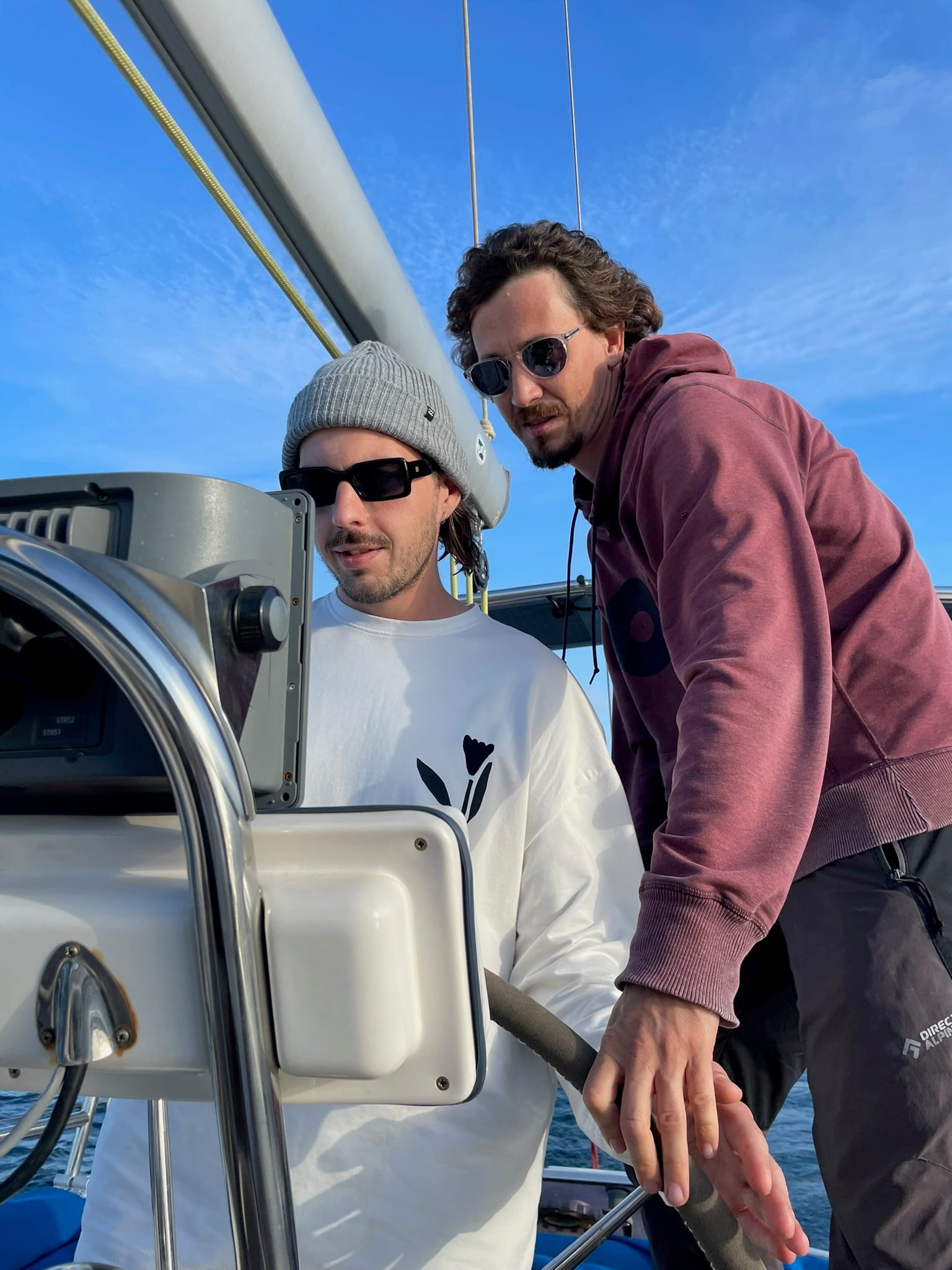 1340 вышли из бухты, поставил парус, до 17 узлов дует, идем под гротом и немного генуи несем. Бакштаг правого галса, скорость 5-5,5 узлов.