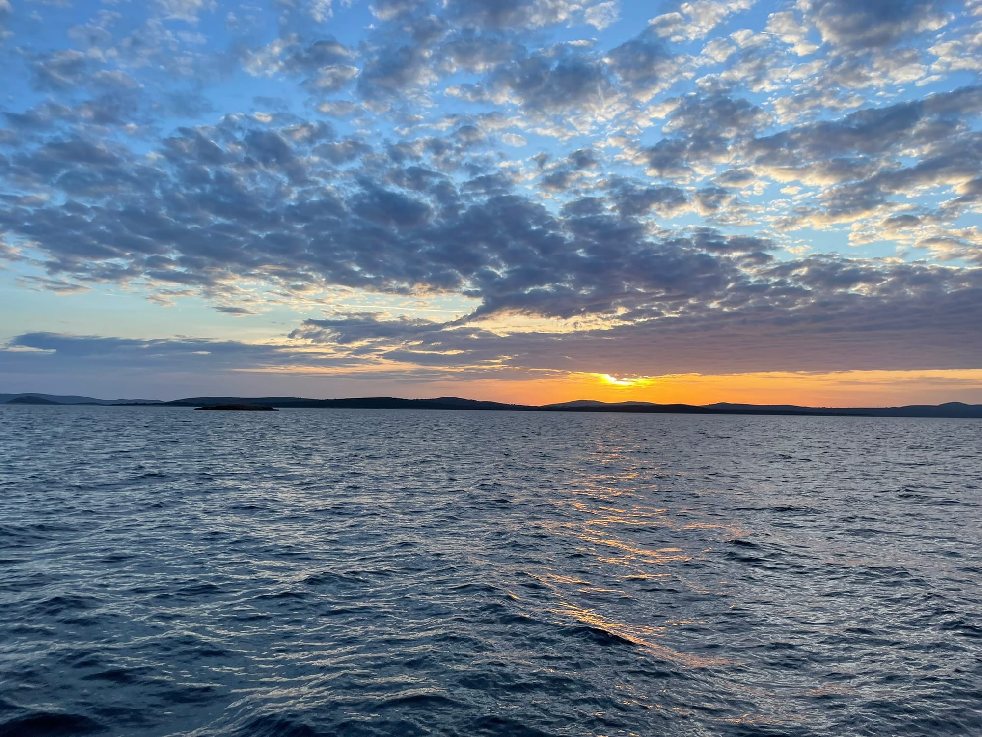 1640 закат, ветерок фордевинд, до 6 узлов. Открыл геную и выключил двигатель, посидим в тишине немного. Под парусом скорость 1,5 узла.