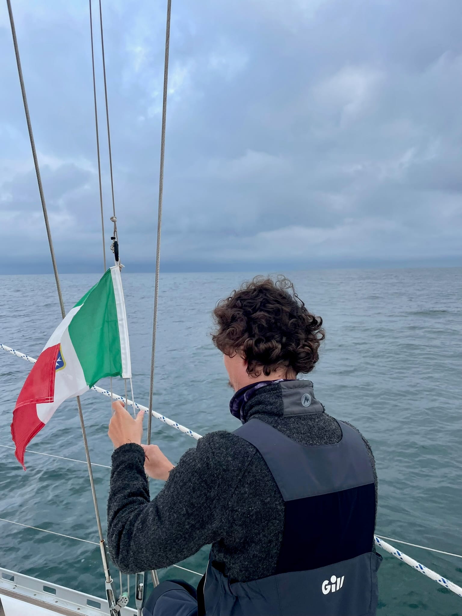 0855 повесил гостевой итальянский флаг. Наташа проснулась и готовит завтрак. Ветра мало, на воде мешанина волн, иногда мотает. На востоке – солнце, на севере – тучи.